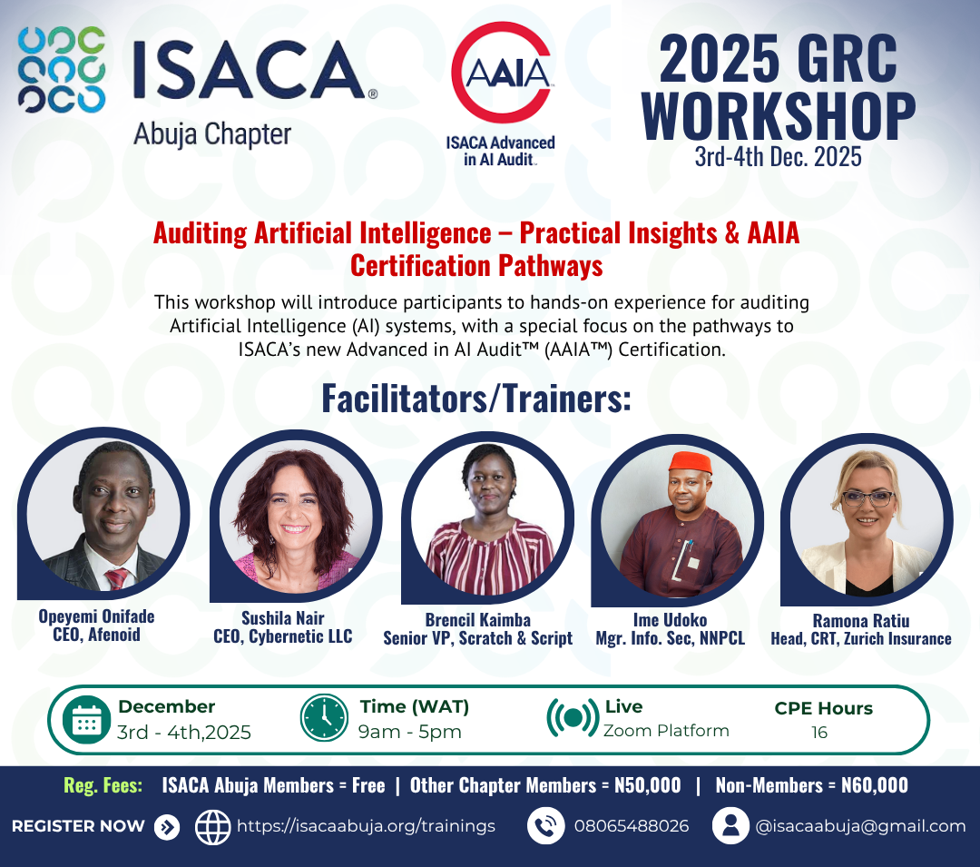 ISACA Abuja Chapter is pleased to specially invite all Information Systems professionals, Artificial Intelligence practitioners, IT Auditors and Digital Trust experts across the globe to participate in the 2025 edition of their Annual Governance, Risk and Compliance (GRC) Workshop, scheduled for 3rd - 4th December, 2025.