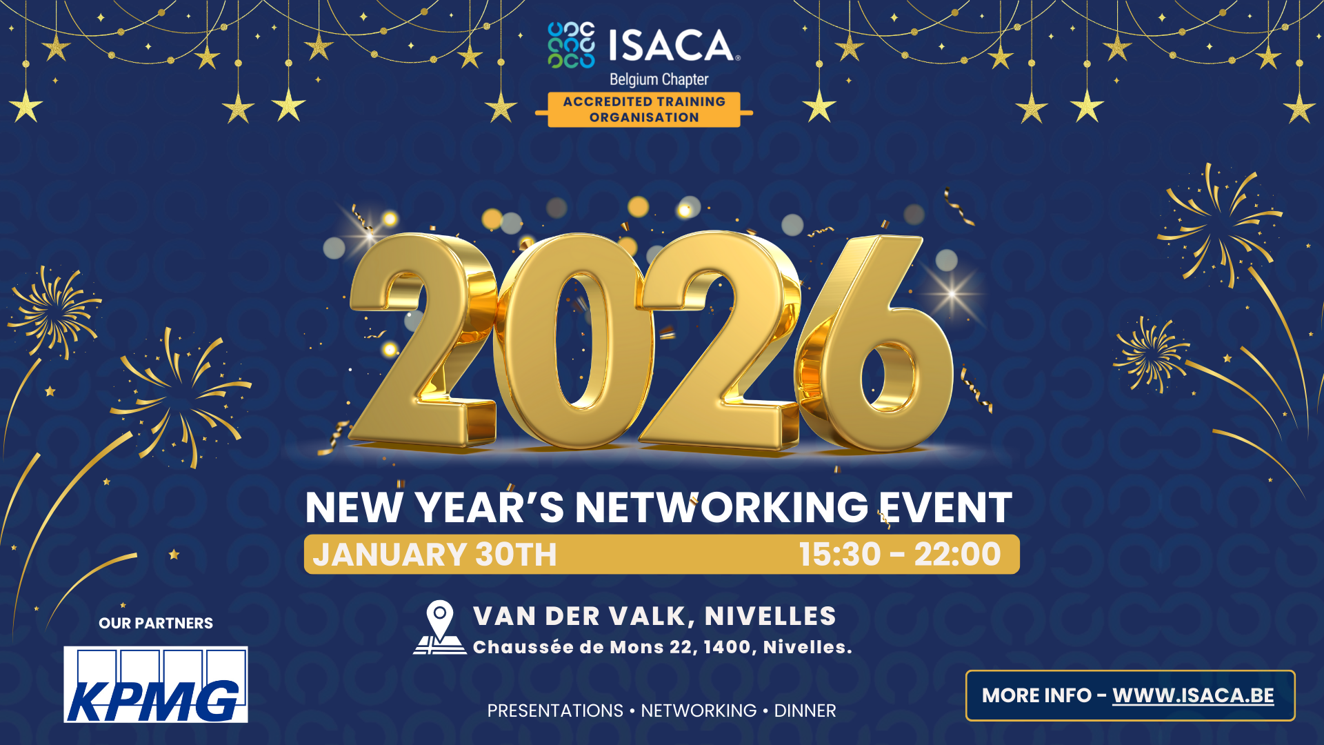 The ISACA Belgium Chapter warmly invites you to join us on Friday, January 30th, 2026, starting at 15:30, at Van der Valk Hotel Nivelles for our annual New Year Networking — an evening designed to inspire, connect, and set the tone for a successful year ahead.