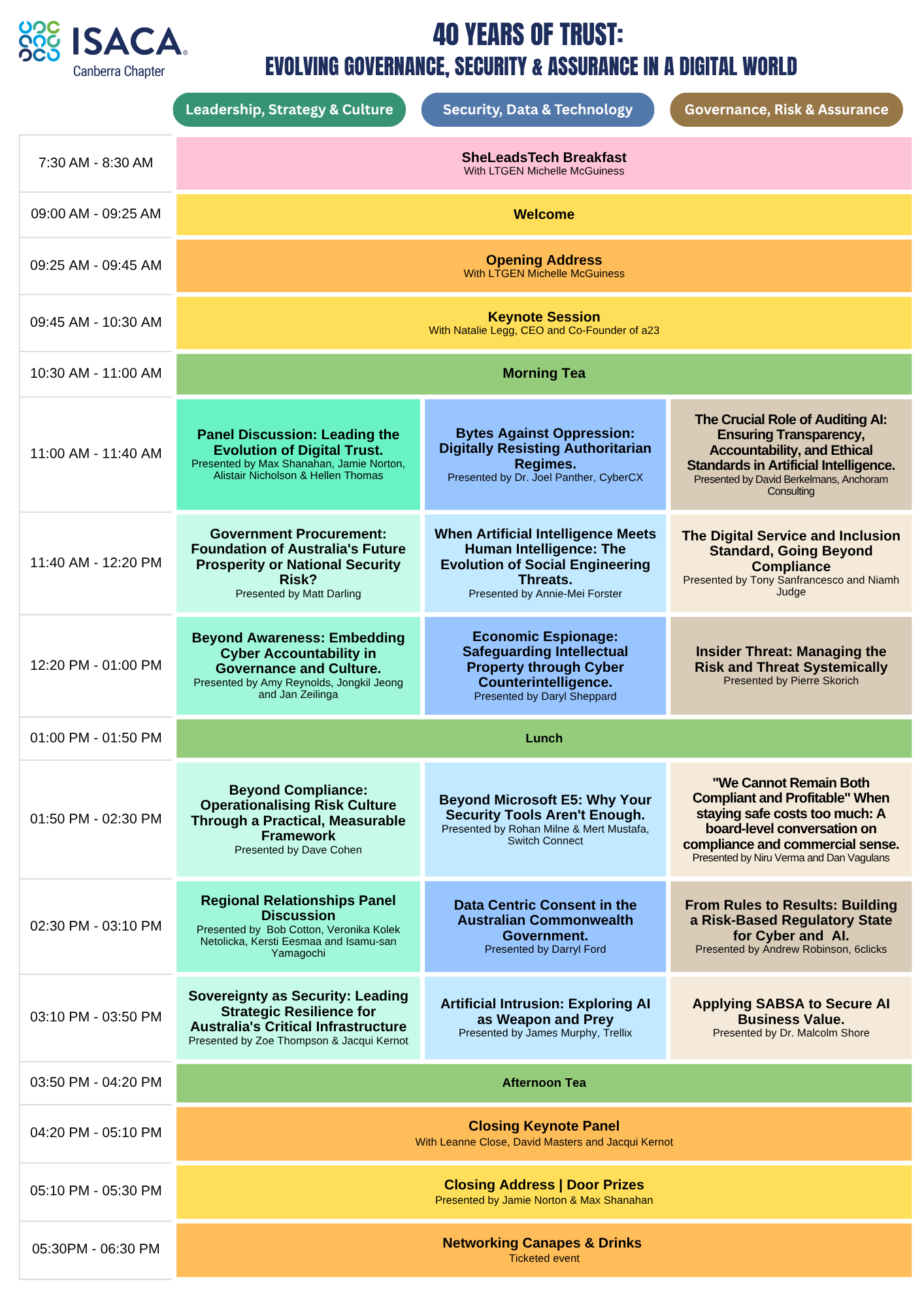 * Early bird tickets ending 30 September - Tickets available here: https://isacaact.eventsair.com/2025-isaca-act-conference/registrations