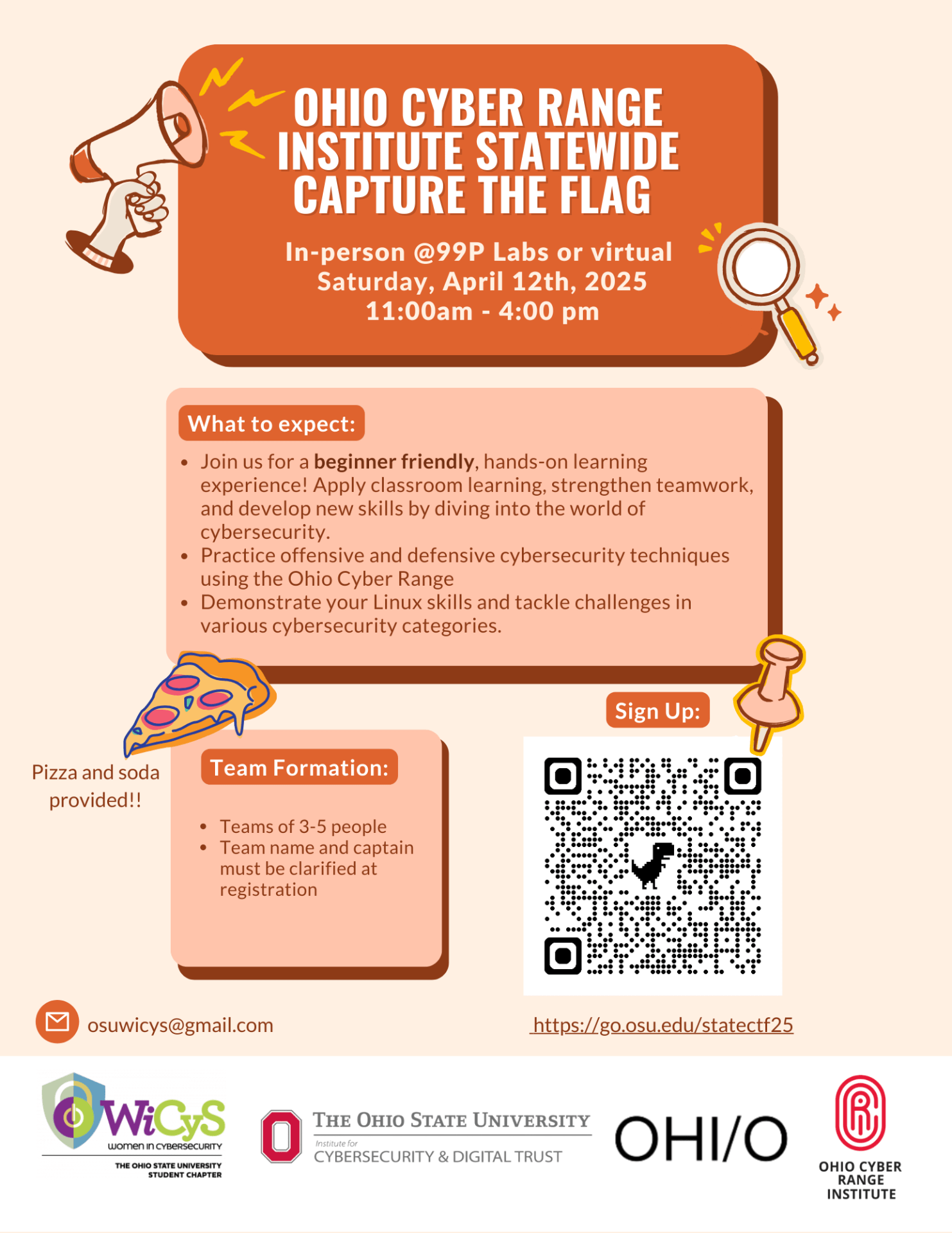 Join Ohio State University Institute of Cybersecurity and Digital Trust (ICDT)'s first annual statewide Capture the Flag event created by the Ohio Cyber Range Institute (OCRI) — a hands-on experience designed for beginners. Team up with your peers to put your classroom knowledge into practice and develop your cybersecurity skills. It's a great opportunity to build your resume and connect with potential employers, all while exploring the world of cybersecurity.