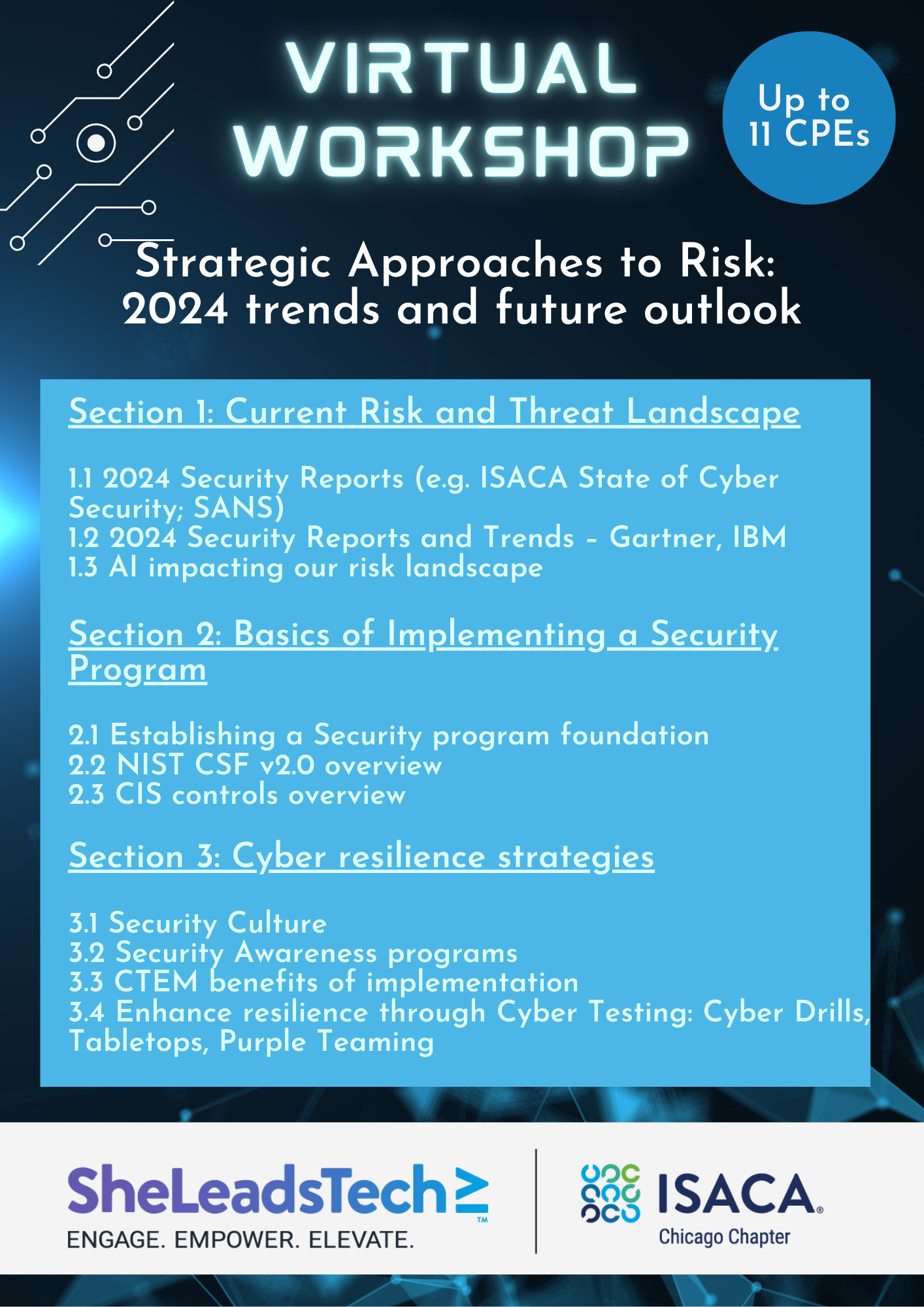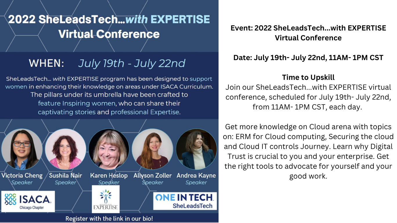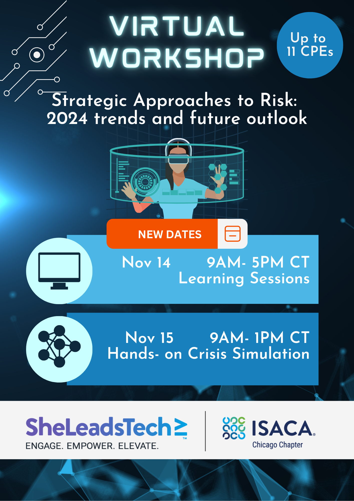 Event: SheLeadsTech with... Expertise Workshop- Artificial Intelligence – Understanding the Technology and Its Risks, and Managing Them Successfully.Date: February 09, 2024Time: 9:00 AM - 5:00 PM CT