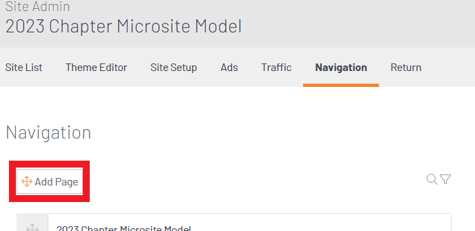 - Click the “Add Page” icon at the top of Navigation Page the and drag it to the navigation level where you want the new item to live.