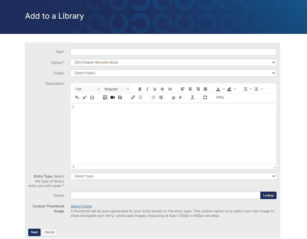 - Library – This should default to the chapter website library. Confirm that the correct library is selected.