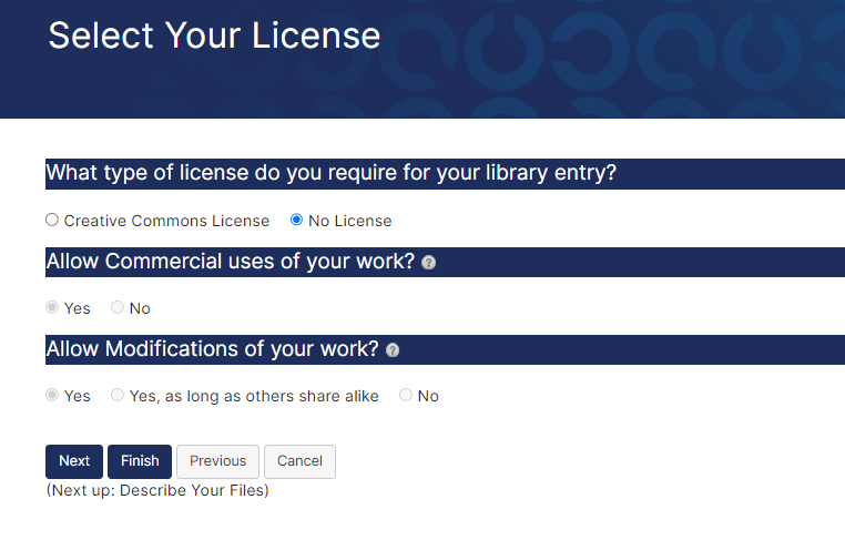 - Copyright Licensed File – Similar to a Standard File Upload, but with an additional step asking the user to specify the copyright protections and allowed uses of the files as defined by Creative Commons. Jump to how to add a copyright licensed file.