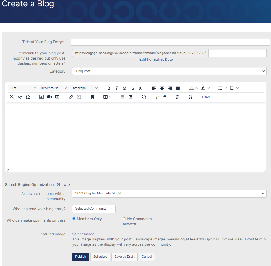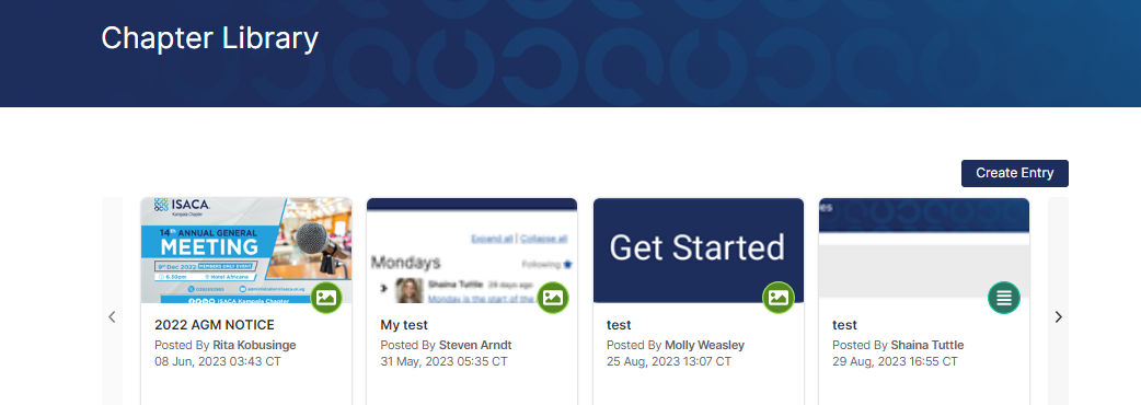 Each chapter has a Chapter Leader Community that consists of all current chapter leaders for your chapter specifically. You may use this community and its library to share information with your fellow leaders, ask questions and store documents. The Chapter President, Webmaster and Administrator (if your chapter has this role) are the Community Administrators for your chapter leader community. Only these roles can edit content and organize the Chapter Leader Community library. ISACA staff will not manage the chapter leader communities.