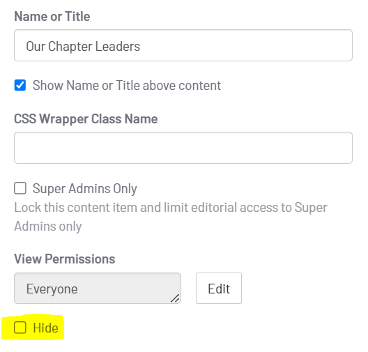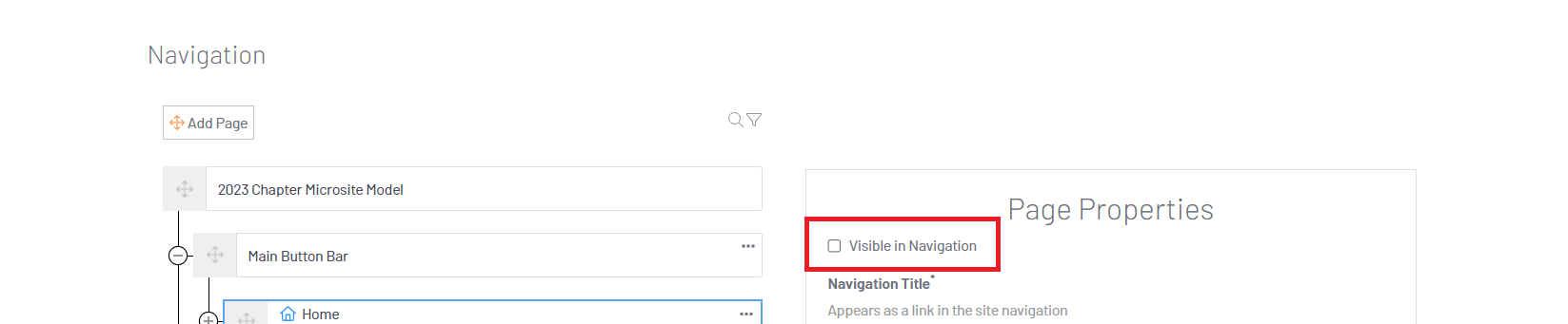 To hide a page, click the “Visible in Navigation” box so that it is not checked. The page remains active if someone has the URL directly to it, but it will not be found within the website navigation.