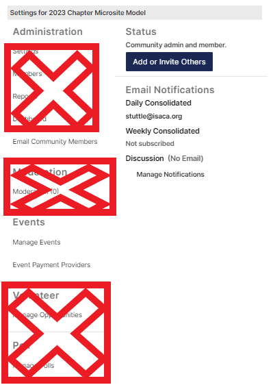 - SITE ADMIN ARE ONLY PERMITTED TO USE THE EMAIL COMMUNITY MEMBERS TOOL UNDER THE ADMINISTRATION SECTION AND ALL OF THE EVENTS SECTION UNDER COMMUNITY SETTINGS.