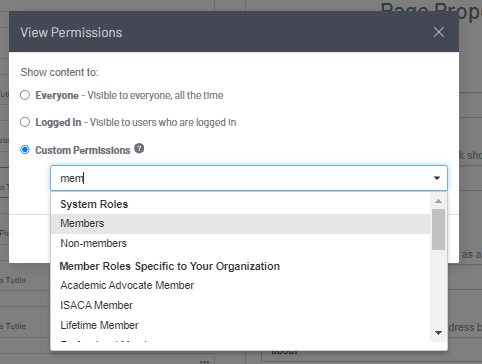 *NOTE: Other system roles will appear that are not applicable to your site. DO NOT SELECT. The page permissions available for chapter websites include "Everyone" (viewable by the public) and Members (viewable by members only).