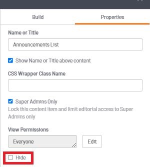 Widgets are placed on pages and used throughout the site as part of the website template. If your chapter will not use a specific widget, you can hide the widget as pictured below. Click on the widget you want to hide, access the Properties in the right menu, and check "Hide". Do not delete the widget from the page.