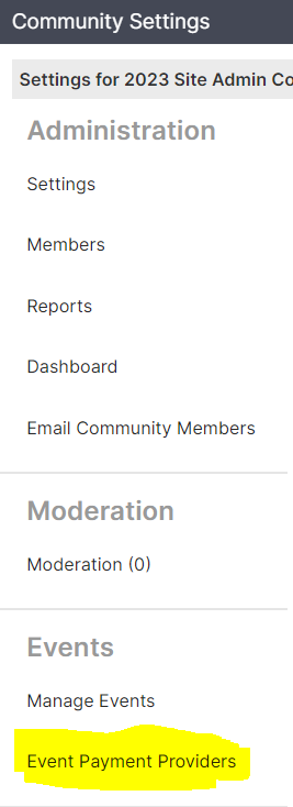 - Click the “Community Settings” button at the top right of your site and then select "Event Payment Providers.”