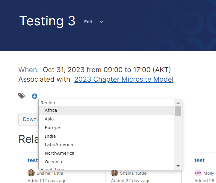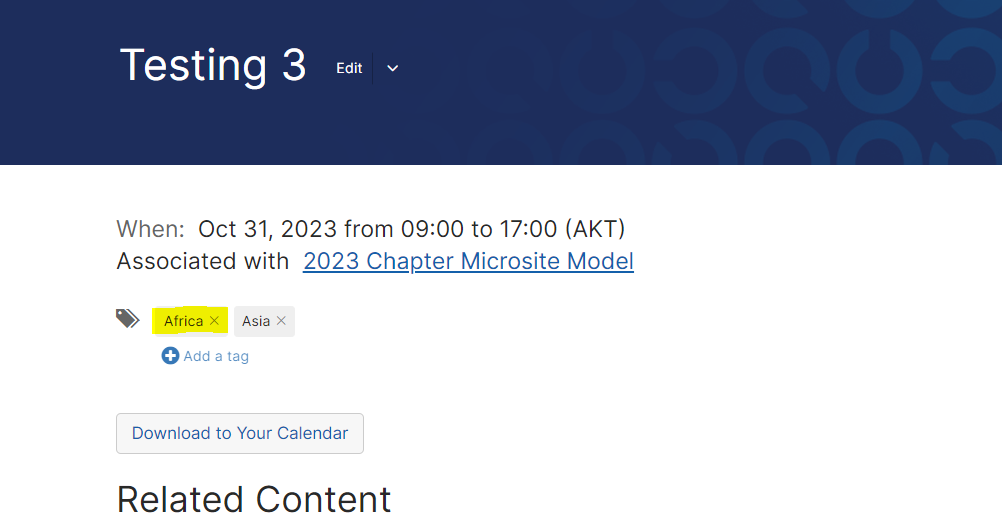 Once your event is created, you are able to add Tags to your event. Tags are used to categorize events by region so that they are easily searchable on the Global Events Calendar. This will help your event reach a broader audience.