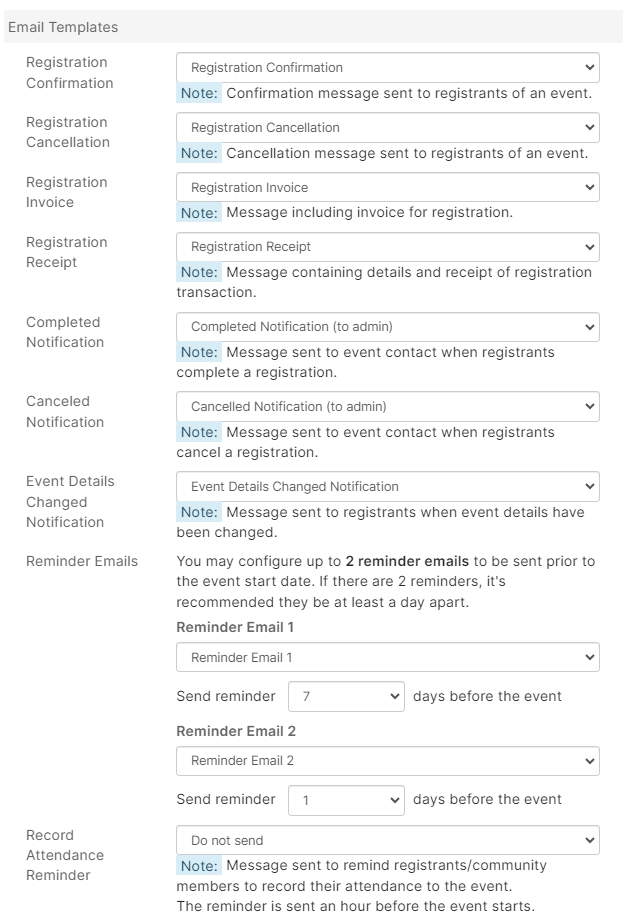 - Notifications that go to the user include registration confirmation, receipt, details changed, reminders, etc. – review the note below each template field to see when and to whom this email will be sent.