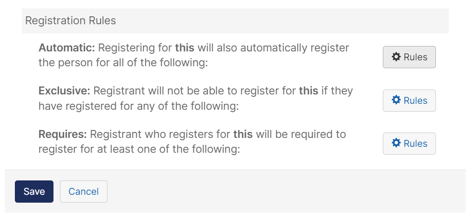 No registrations are collected. Members can download the event to their calendar. Admins can use this event type as a "Save the Date" and switch to a different registration type later on. |