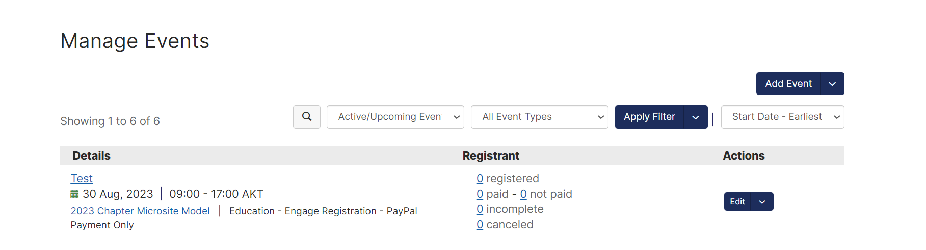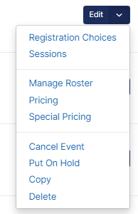 The title of an event will always be a hyperlink that you can click on to open the event for review and editing under the Details Section. Here you will also see the Registrants for your event. You can click on these numbers to see who registered, paid, cancelled, etc. Under Actions you will find the "Edit" button. “Edit” opens the event in edit mode so that you can make changes. The drop-down arrow will show other options (varies depending on Event Type):