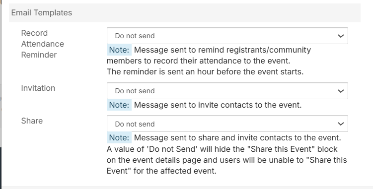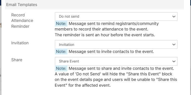 The email templates will prepopulate with your event information and align with the correct action for each template automatically depending on the Event Type you choose. Email Templates cannot be edited by site admins. This functionality was opened up for site admins so that you can determine when and if reminder emails are sent OR if event contacts should receive notifications.