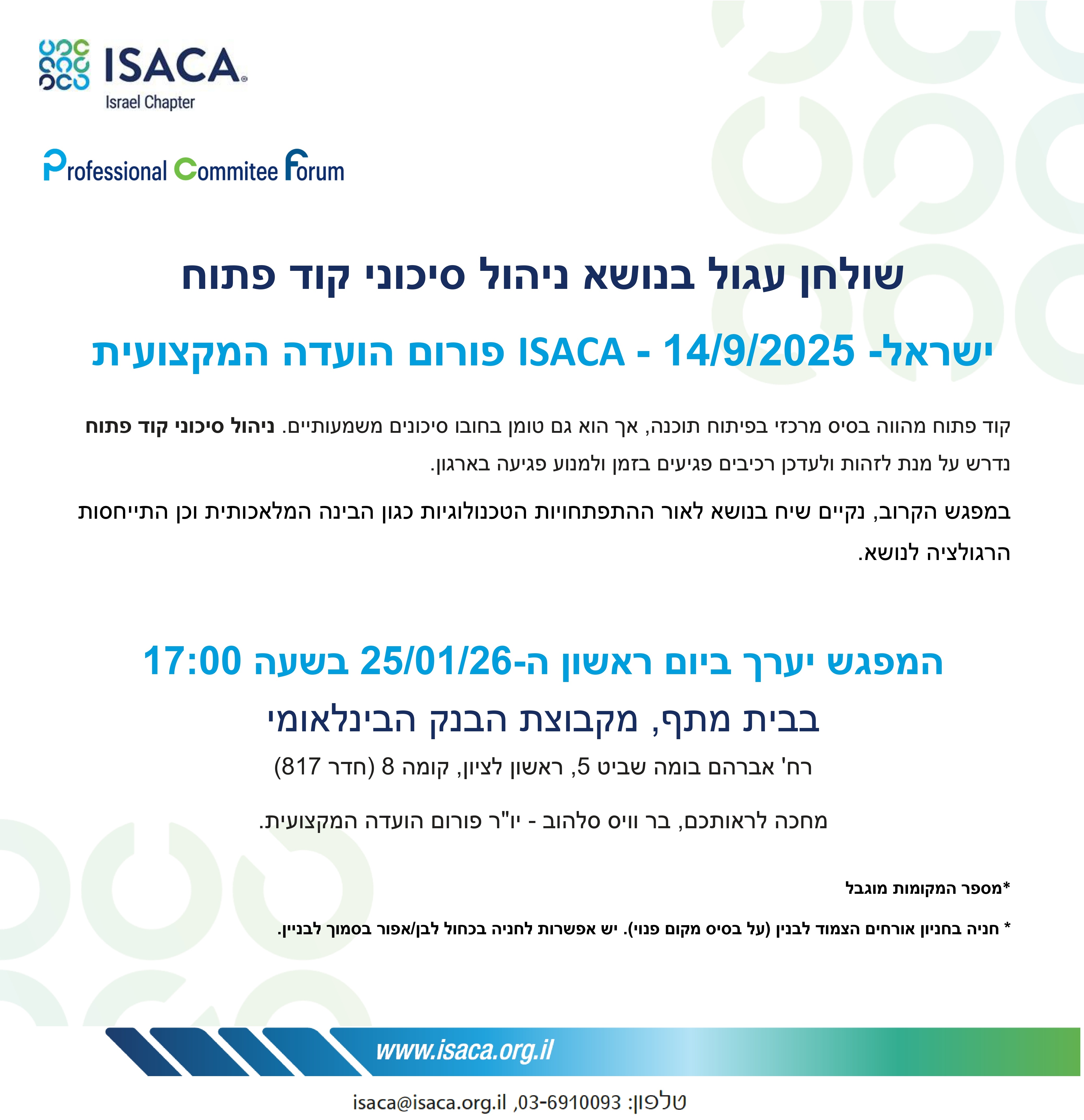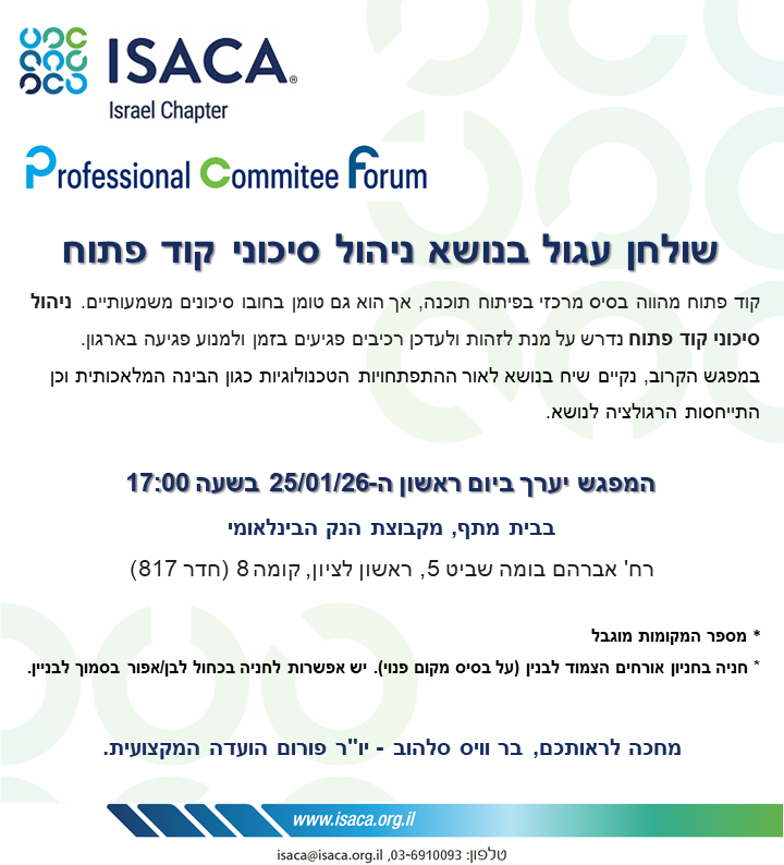 רגע לפני תחילת השנה החדשה וחופשת החגים נפגשנו לדון בפורום הועדה המקצועית על תפקיד הביקורת באירוע סייבר. במפגש אירחנו את נדב עלה, בעל ניסיון רב בעבודה מול גופי ביקורת בחברות רבות ומגוונות וכיום יועץ עצמאי בתחום הסייבר המתמחה בתרגול הנהלות ודירקטוריונים כהכנה להתמודדות עם אירועי סייבר. נדב שיתף מנקודת מבטו לגבי מהות אירוע סייבר ותפקיד הביקורת באירועי סייבר, בדגש על האתגר בין שמירה על 'מעורבות בזמן אמת' לבין הצורך בשמירה על עצמאות ביקורתית. כמו כן, הומלץ לבחון אימוץ גישת "איפכא מסתברא" שמוכרת מתחום הביטחון עבור אירועי סייבר. בנוסף, הוצגו פרקטיקות מומלצות לביקורת פנימית בנושא סייבר, כגון השתתפות בתרגילים, תיעוד אירועים, וקביעת מדדי ביצוע מרכזיים (KRI).