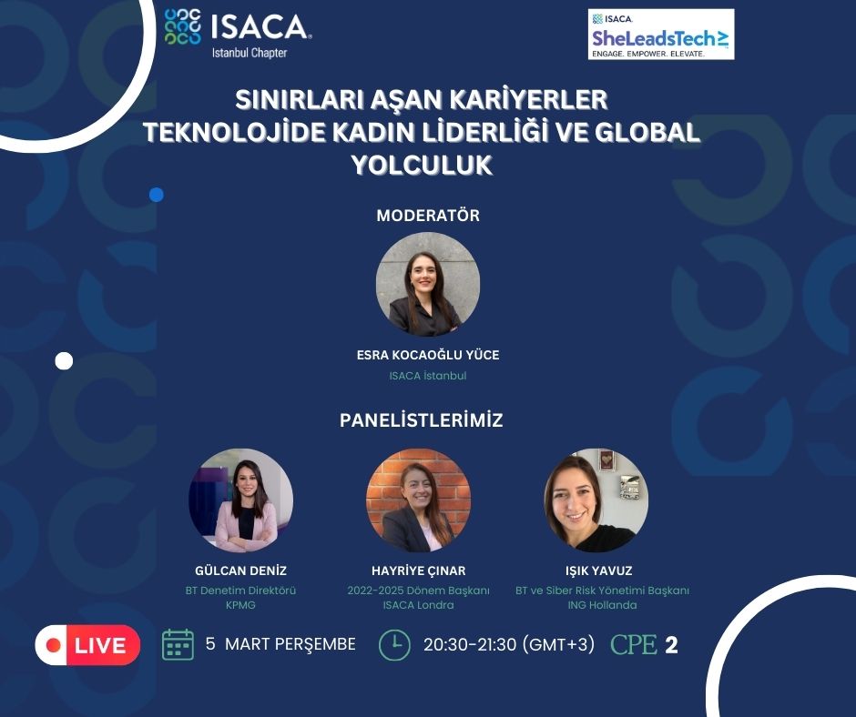 ISACA Istanbul Chapter SheLeadsTech Çalışma Grubu tarafından düzenlenen bu özel etkinlikte; teknolojide liderlik, kariyer gelişimi ve global deneyimler farklı bakış açılarıyla ele alınıyor.