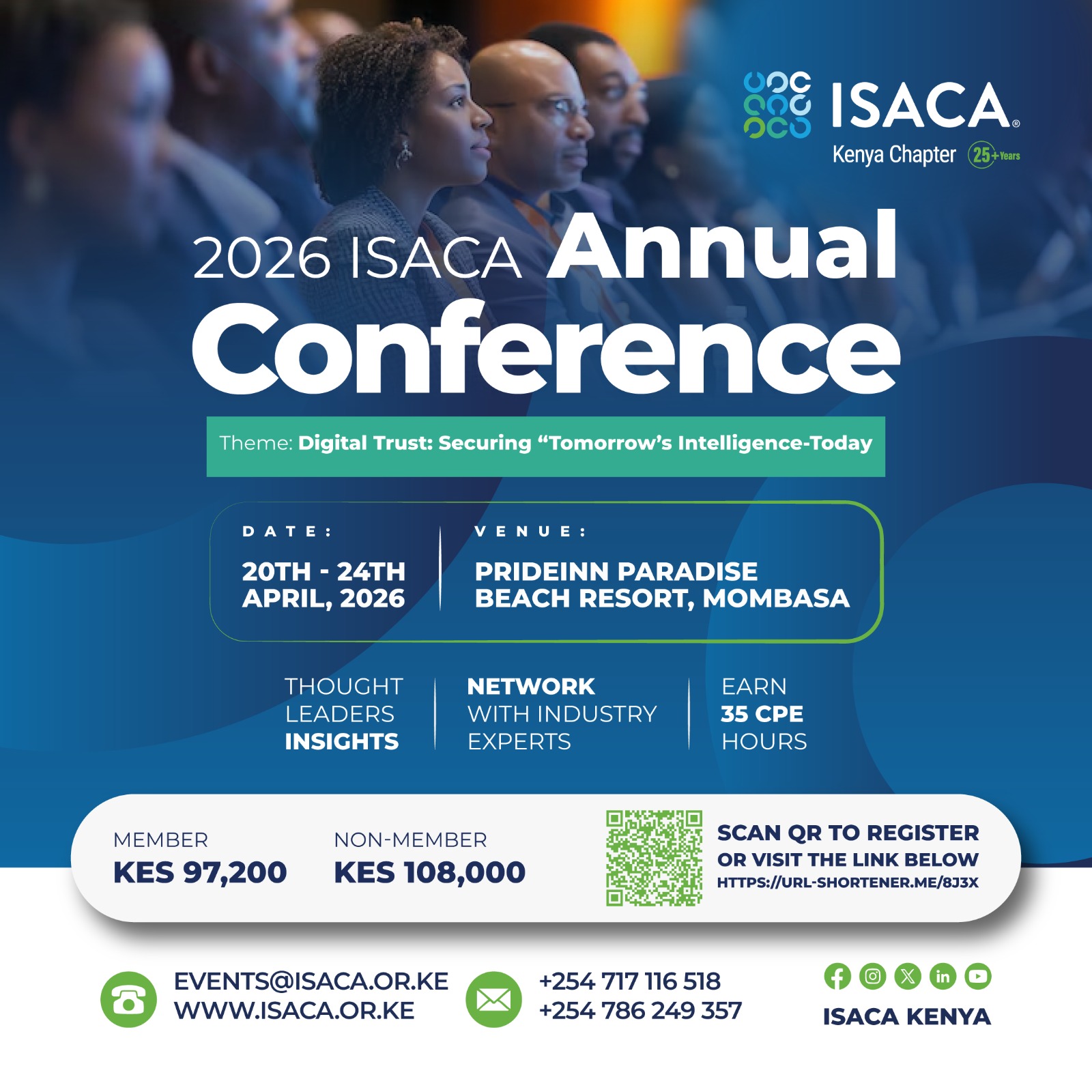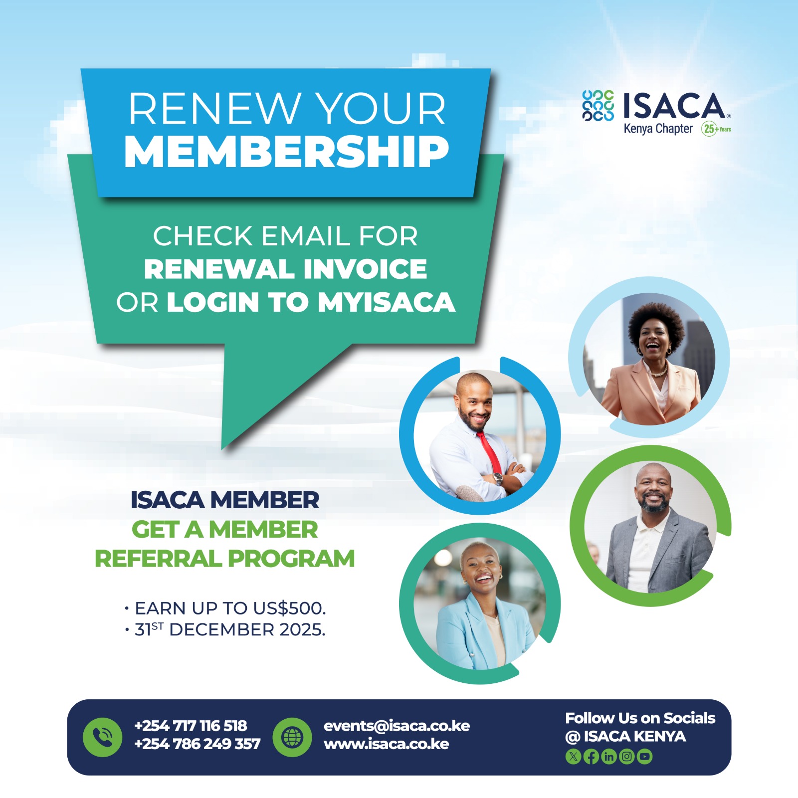 The ISACA Kenya was founded in December 1999 by a group of volunteers and was registered in March 2000. The Chapter has since experienced tremendous growth in membership and currently has over 2000 members. We work to support and connect local digital trust professionals who are eager to network and advance their careers. We look forward to connecting with you! Visit the "About" page to learn more about our chapter and contact chapter leaders.