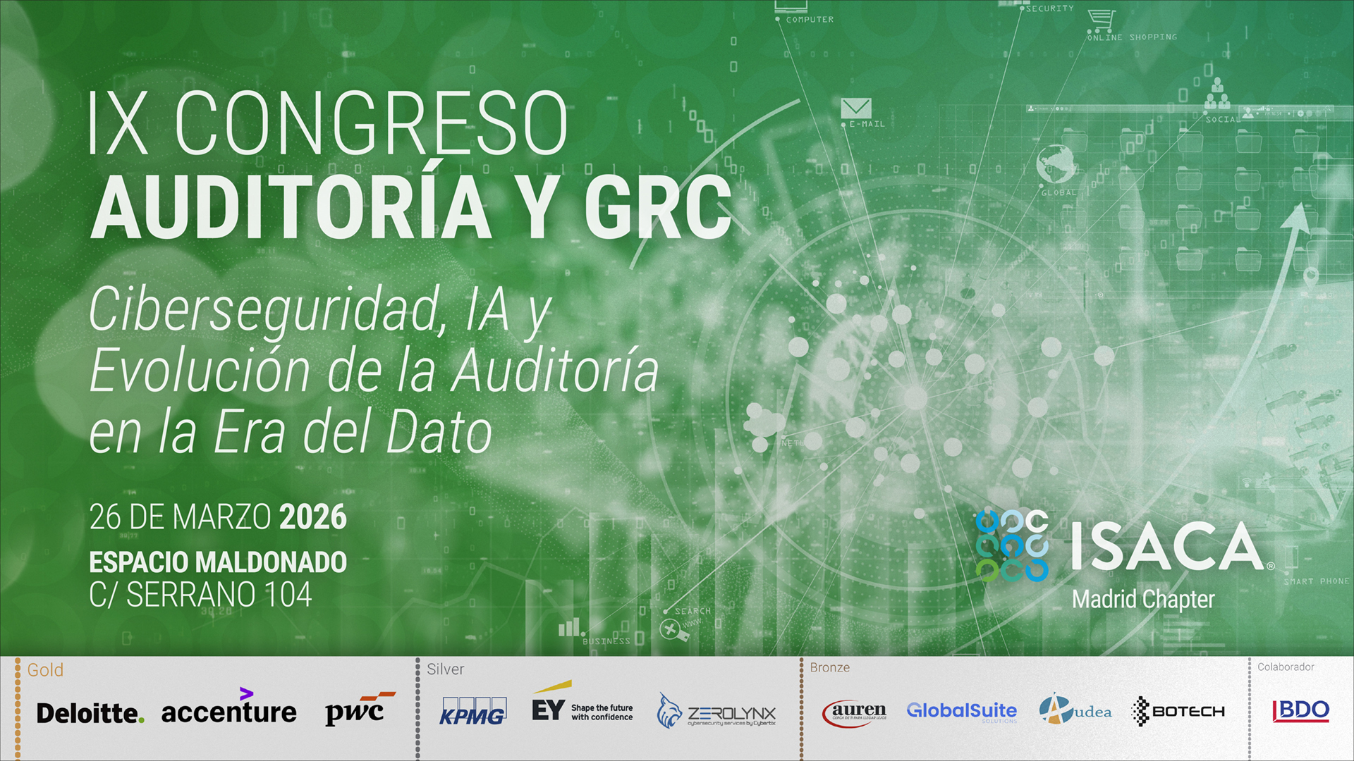 El jueves 26 de marzo de 2026, ISACA Madrid celebró una nueva edición del Congreso de Auditoría y GRC bajo el título Ciberseguridad, IA y evolución de la auditoría en la “Era del Dato”, una jornada completa pensada para profesionales de auditoría, gobierno, riesgo, cumplimiento y ciberseguridad. El encuentro tuvo lugar en el Espacio Maldonado (calle Serrano 104, Madrid) y se desarrolló en formato exclusivamente presencial.