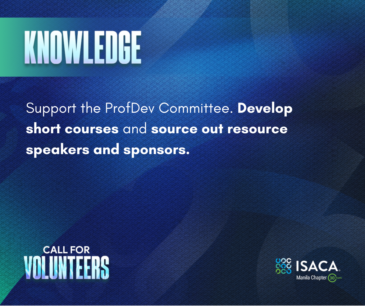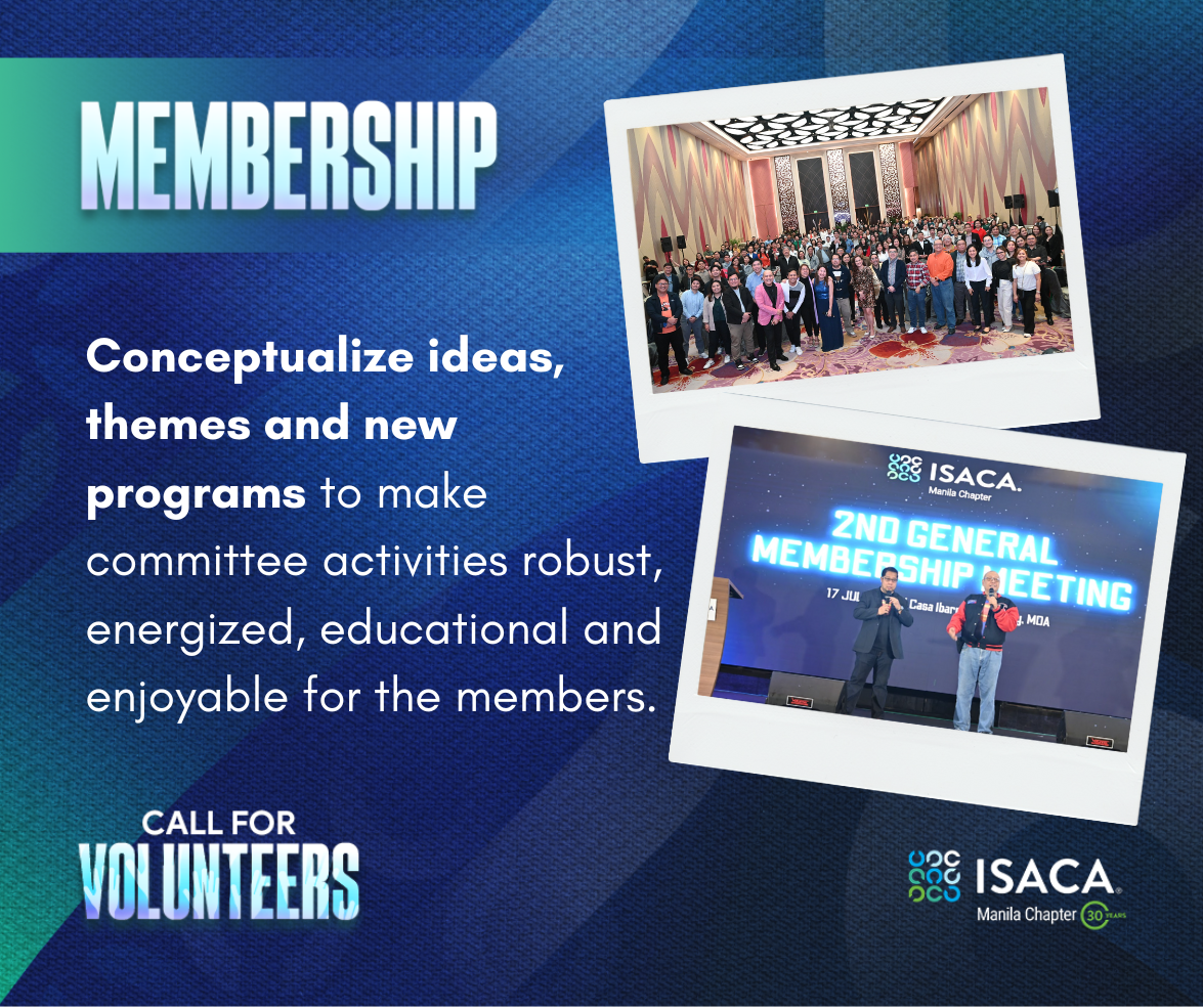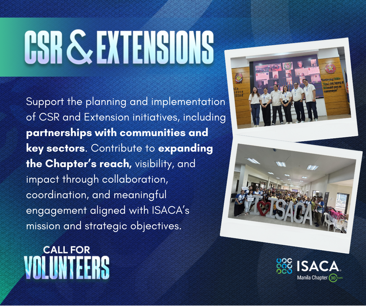 ISACA Manila Chapter is inviting passionate, driven, and service-oriented members to join our pool of Chapter Volunteers!