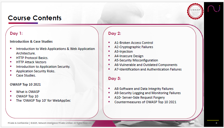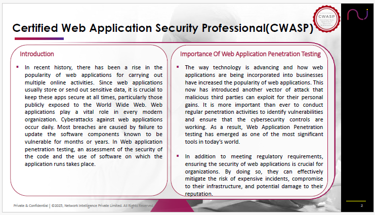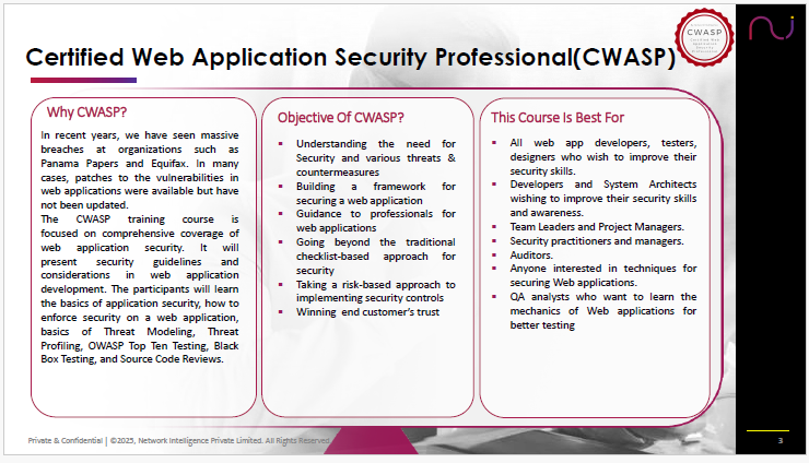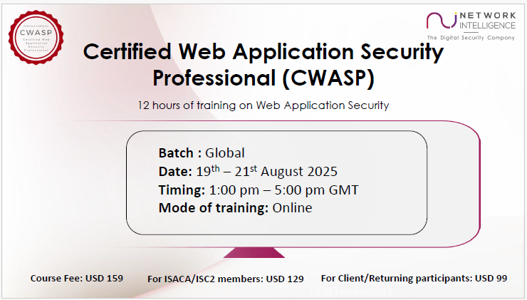 Network Intelligence - a global cybersecurity firm offering assessments, advisory, consulting, certification & trainings is offering a 3-day hands-on training titled as Certified Web Application Security Professional (CWASP) Training.
