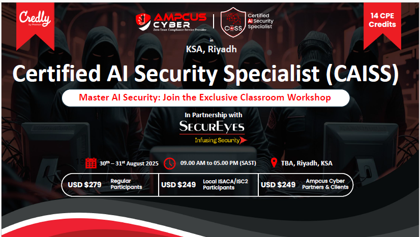Ampcus Cyber - a Digital Payments Cyber Security firm providing compliance consulting on topics including ISO, HIPAA, GDPR, PCI, SOC2, etc., besides conducting public workshops periodically on different cybersecurity topics, is offering a two-day in-person Certified AI Security Specialist (CAISS) Workshop as per details below: