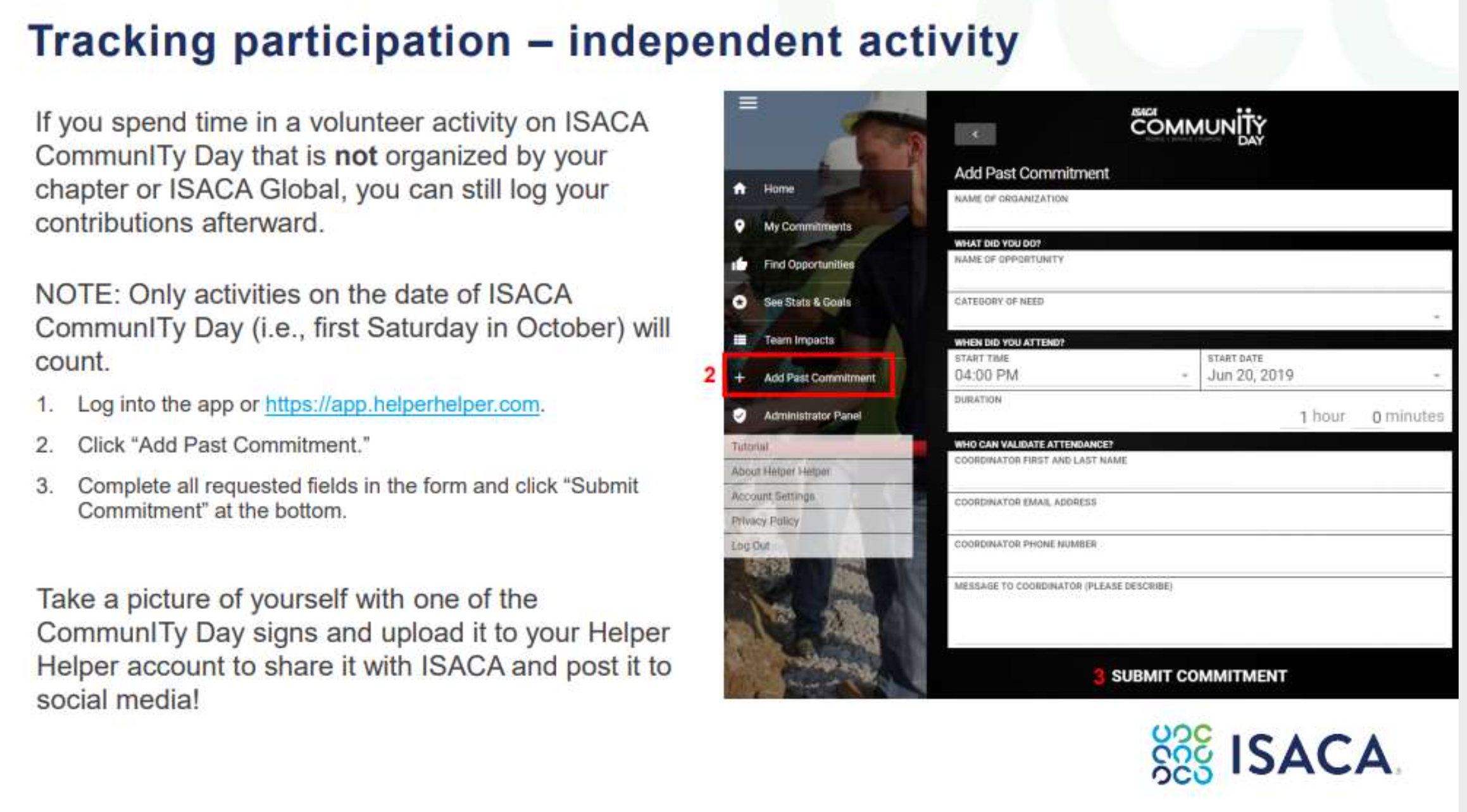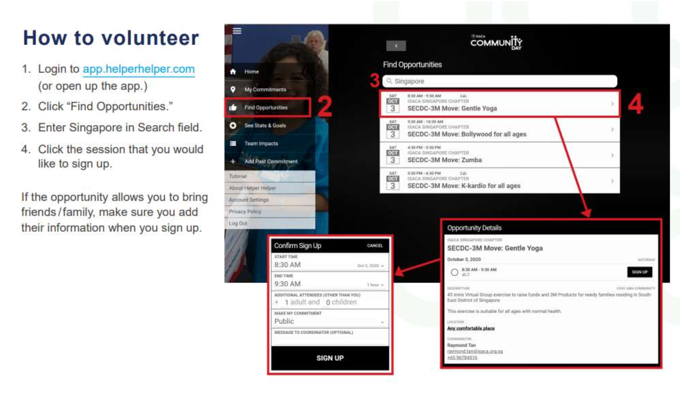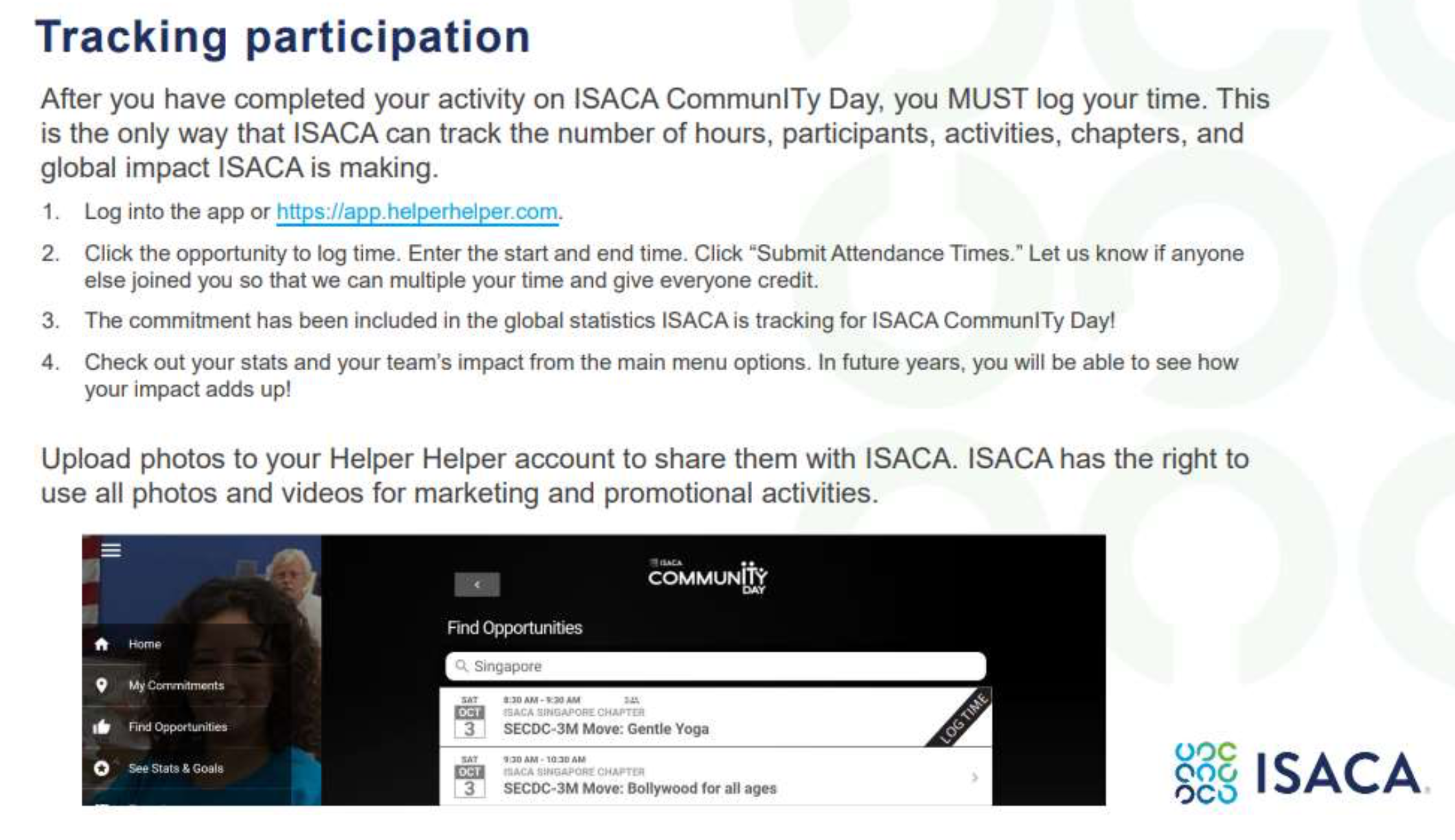 [Please note - this page is an event placeholder, you will have to register on https://app.helperhelper.com/signup/732?show=team ]October 3, is ISACA Global Community Day, a day where all ISACA chapters across the globe along with ISACA HQ arranges various community events to contribute back to the society. ISACA Singapore chapter will be collaborating with South-East Community Development Council partnered with 3M Singapore in 3M Move programme.