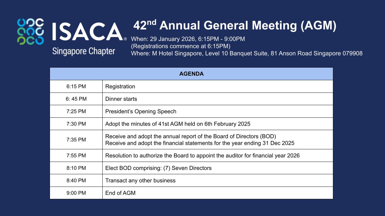 Interested members who didn't manage to pre-register and would still like to attend the AGM, please write into memberservices@isaca.org.sg by 23 Jan 2026, 4:00PM to confirm your seat before it's gone.