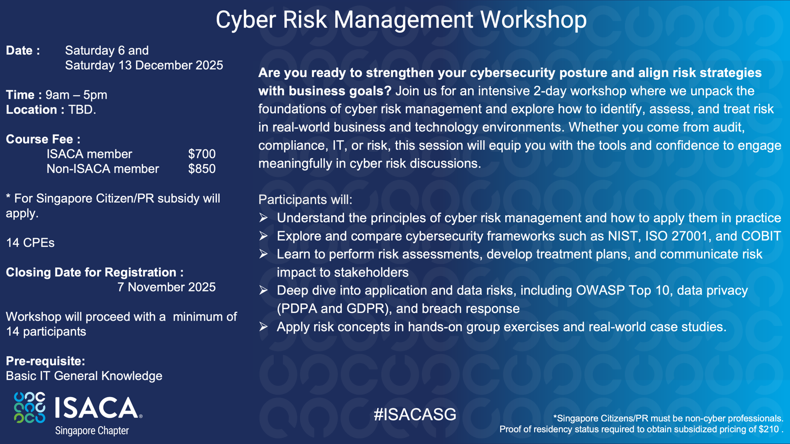 For cancellation due to unforeseen circumstances, please inform memberservices@isaca.org.sg by 7 November 2025.